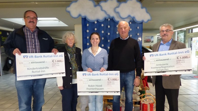 Das Foto zeigt die Spendenübergabe: von links Josef Hofbauer (Kinderkrebshilfe Rottal-Inn), Maria Gebhard, Jutta Fuchsberger (beide Robin Hood), Spender Albert Gallersdörfer und Georg Buchhart (Ambulante Krankenpflegestation).