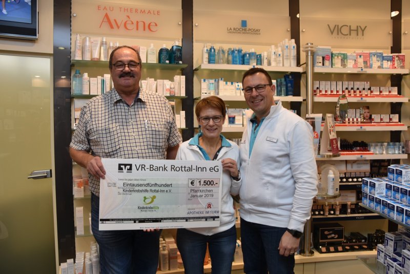 Jedes Jahr in der Adventszeit stellt das Ehepaar Christa und Michael Wellenhofer von der Apotheke im Turm eine Spendenbox für eine wohltätige Einrichtung auf. Heuer ging der Erlös an die Kinderkrebshilfe Rottal-Inn. Den ganzen Dezember über konnten Kunden ihre dort gesammelten Bonuspunkte oder Bargeld in die Box werfen. Dabei kam eine beachtliche Summe von 848,07 € zusammen.