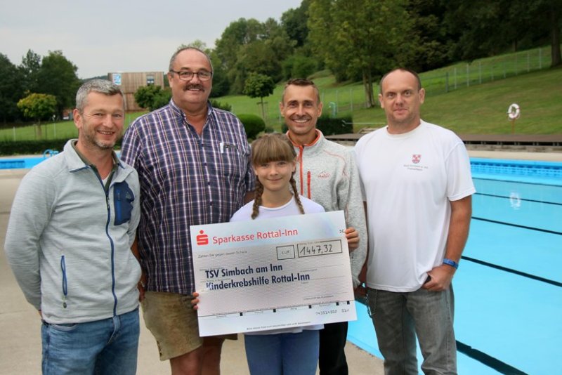 Zum ersten Mal fand im Schwimmbad ein Benefizschwimmen des TSV Simbach statt, bei dem fast 2900 € erwirtschaftet wurden. Nun erfolgte an gleicher Stätte eine Spendenübergabe an die Kinderkrebshilfe Rottal-Inn in Höhe von fast 1450 €.