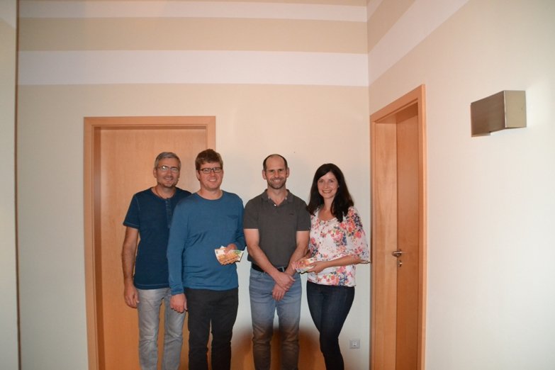 Das Foto zeigt die Spendenübergabe: über jeweils 500 € durften sich Claudia Wimmer (rechts) von der Kinderkrebshilfe Rottal-Inn e.V. sowie Hubert Gruber (links) und Stefan Straubinger (2. v. links) von Benefiz-mit-Malefiz e.V. freuen.