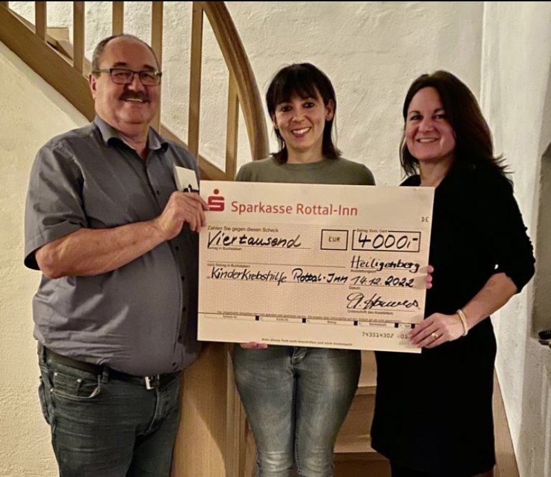 Das Foto zeigt die Übergabe des Spendenschecks an Josef Hofbauer, den 1. Vorstand der KinderkrebsHilfe Rottal-Inn.