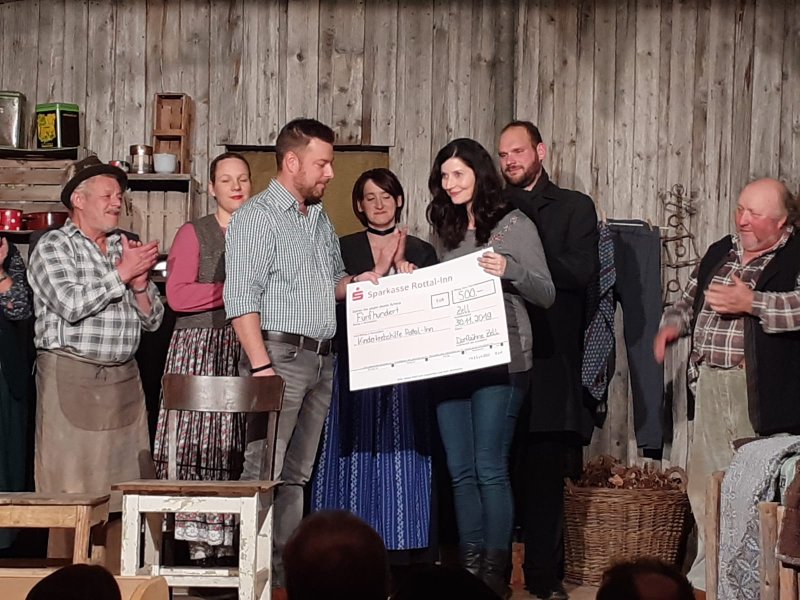 Aber nicht nur dem Publikum wollte der Theaterverein eine Freude bereiten, denn es lag ihnen zudem am Herzen, mit einem Teil der Einnahmen einen wohltätigen Zweck zu unterstützen. Da es Ihnen wichtig war in der näheren Region zu helfen, fiel die Wahl auf die KinderkrebsHilfe Rottal-Inn e.V.. So durfte sich nun Schriftführerin Claudia Wimmer über einen Spendenscheck über 500 € aus den Händen von 1. Vorstand Florian Mittermeier freuen.