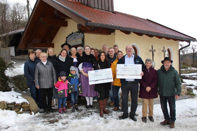 Das Foto zeigt die Spendenübergabe: Die Vertreter der beteiligten Institutionen waren zur Scheckübergabe an Tanja Heining und Josef Hofbauer (jeweils mit Spendenscheck) zur Dorfkapelle gekommen.