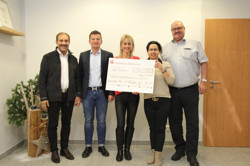 Das Foto zeigt die Scheckübergabe: von links 1. Bürgermeister Bad Birnbach Josef Hasenberger, Gerhard und Manuela Maier, Fernanda Haslinger und 1. Vorstand der KinderkrebsHilfe Josef Hofbauer