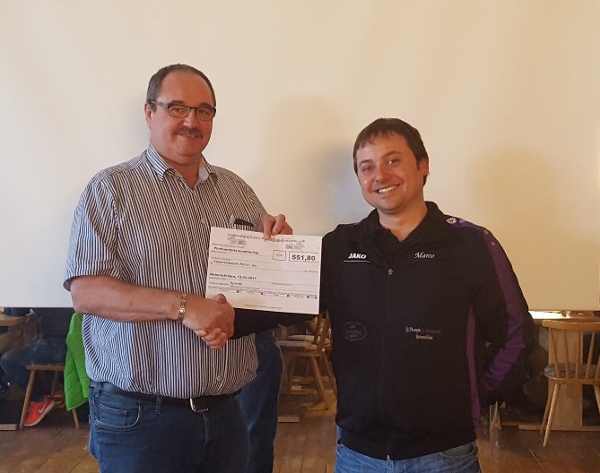 Das Helferessen der Hebertsfeldener Faschingsfreunde wurde heuer für die schon jährliche Spendenübergabe an die Kinderkrebshilfe Rottal-Inn e.V. genützt. Josef Hofbauer (Foto links) von der Kinderkrebshilfe darf seit 2011 jedes Frühjahr den Erlös aus dem vorangegangenen Christkindlsmarkt in Empfang nehmen. Heuer übergab der 1. Faschingsfreunde-Vorstand Marco Raffner 551,80 € aus dem Verkauf von selbstgebackenen Plätzchen und Gulasch aus der Gulaschkanone.