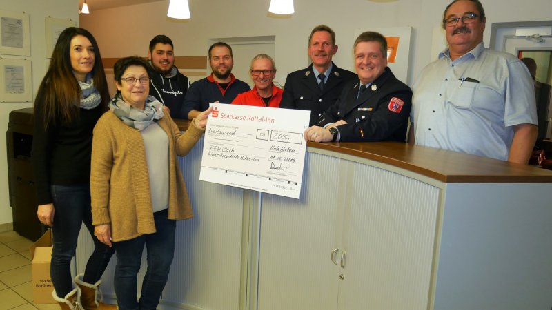 Jeweils 1000 € gab die Firma Bachmaier und Sohn KG an die KinderkrebsHilfe Rottal-Inn und an die Feuerwehr Buch. Wie (ab 2. v. re.) Kommandant Markus Deser und Vorstand Georg Vorderobermeier versicherten, gehe der Betrag vollständig in die Finanzierung eines neuen Feuerwehrfahrzeuges ein. Josef Hofbauer (re.), Vorstand der KinderkrebsHilfe Rottal-Inn, erzählte davon, dass dank der Spenden jungen Familien geholfen werden könne, die gerade im Existenzaufbau stünden und dann ein Kind die schwere Diagnose “Krebs” erhalte. Zudem werden Nachhilfestunden, Beratungen und Mittel zur Verfügung gestellt, die die Lebensqualität junger Patienten verbessern können. Bei der Spendenübergabe waren außerdem noch dabei (von links): Yvonne, Waltraud und Kevin Bachmaier, Stefan Wägner.