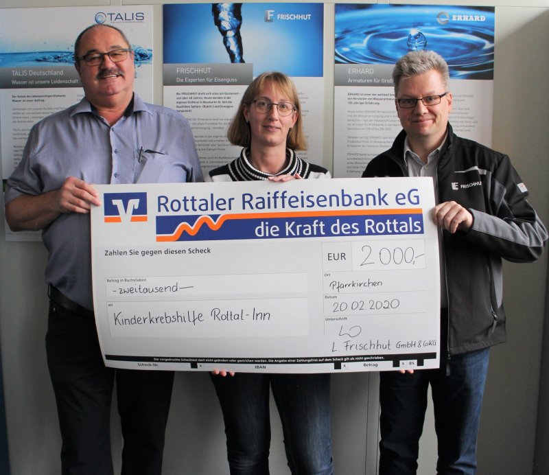 Im Rahmen verschiedener Aktionen im Jahr 2019 (u.a. der jährlichen Weihnachtsfeier) wurden über 1150 € an Spenden von den Mitarbeitern der Firma Frischhut GmbH & Co.KG eingenommen. Diese Summe wurde von der Geschäftsführung aufgerundet, so dass insgesamt 2000 € an die KinderkrebsHilfe Rottal-Inn überreicht werden konnten.