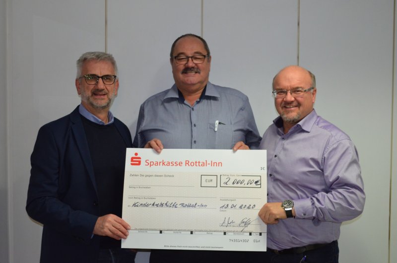 Dieses Mal überreichten die Geschäftsführer Manfred Fischer (Foto links) und Andreas Widl (rechts) einen Scheck über 2000 € an die KinderkrebsHilfe Rottal-Inn. Dessen Vorsitzender Josef Hofbauer (Mitte) bedankte sich für die großzügige Unterstützung. Das Geld werde man in vollem Umfang für die Betreuung der Familien einsetzen, sagte Hofbauer.