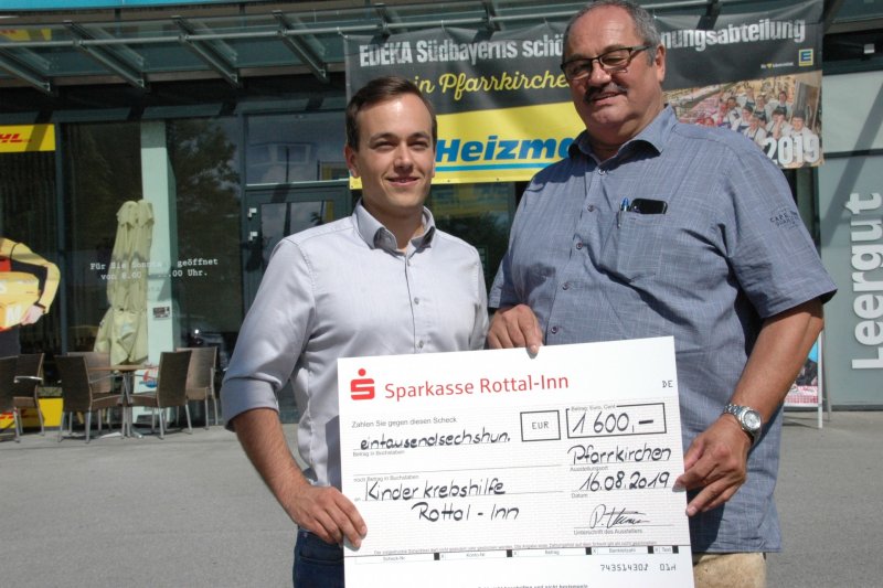 Entsprechend groß war der Betrag, der für die KinderkrebsHilfe Rottal-Inn herauskam. Gut 1400 € waren es, und “Fleischi” selbst rundete die Summe dann noch auf 1600 € auf. Den symbolischen Scheck überreichte jetzt Philipp Heizmann (auf dem oberen Foto links) an den Vorsitzenden der KinderkrebsHilfe, Josef Hofbauer.