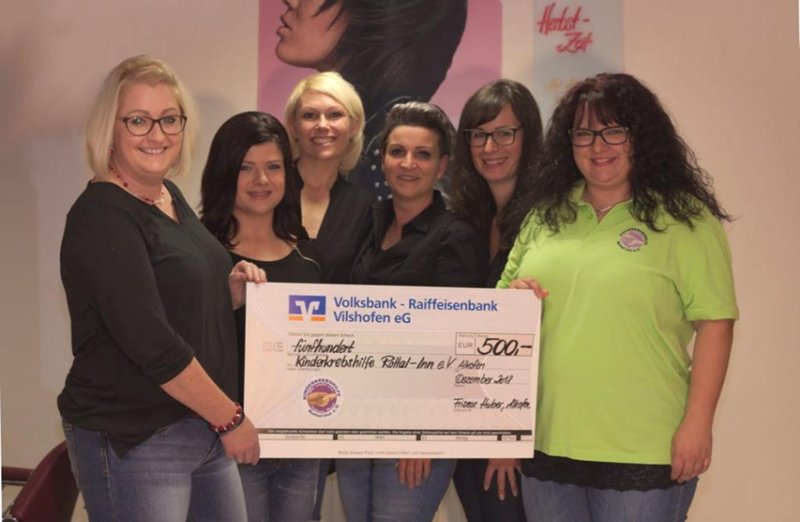 Erika Nöbauer, Chefin des Friseursalon Huber in Alkofen setzte die letztjährige Aktion fort und zweigte wieder einen Monat lang je 1 € pro Haarschnitt oder sonstigen Anwendungen ab. Das Geld kam in ein Sparschwein, das nun wieder für die Kinderkrebshilfe Rottal-Inn e.V. gespendet wurde. Als Mitarbeiterin im Salon Huber übernahm die neue Familienbetreuerin Simone Wallner die Spendenübergabe für den gemeinnützigen Verein. Ihre Chefin und ihre Kolleginnen wurden von ihr unterrichtet, dass der Verein in den letzten zwei Monaten 5 neue Familien, auch teilweise aus dem Landkreis Passau aufgenommen hat.