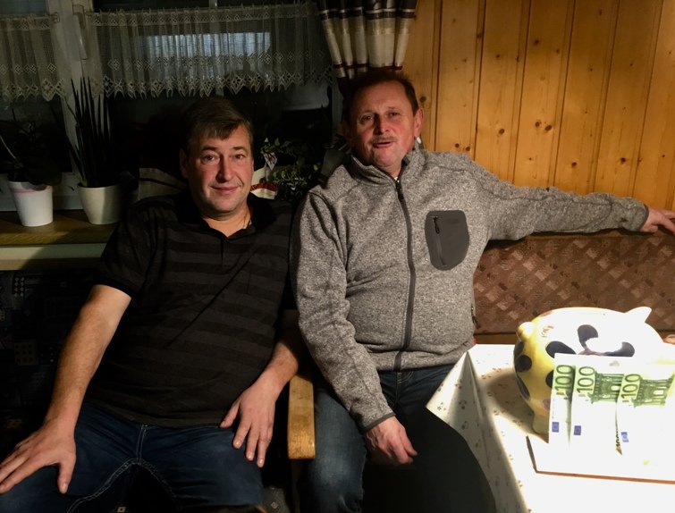 Erwin Kettl (Foto rechts) legte von seinem Geld nochmal 300 € drauf und lud ausserdem die gesamte Vorstandschaft incl. Partner zu einem Essen ein. Er wollte damit danke für unsere Arbeit sagen. Bei einer der nächsten Sitzungen wird er uns dann verköstigen. Das geleerte Schwein steht bereits wieder an seinem alten Platz auf der Verkaufstheke.