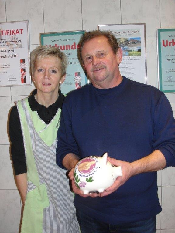 Der Inhaber der Metzgerei, Erwin Kettl stockte den Betrag auf 600 € auf und stellte das Schwein wieder auf seine Verkaufstheke damit auch heuer wieder eine tolle Summe zusammen kommen kann. Das Foto zeigt Herrn und Frau Kettl.