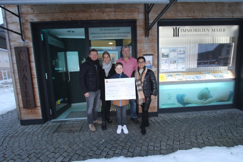 Das Foto zeigt die Spendenübergabe: von links Dipl.-Immobilienwirt Gerhard Maier mit Frau Manuela und Sohn Felix, Rainer Schmidt und Fernanda Haslinger