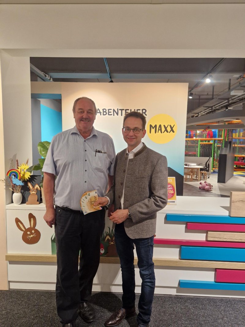 Im Kinderland von MeinMaxx können Familien den Geburtstag ihrer Kinder gegen eine freiwillige Spende feiern. Da dieses tolle Angebot von MeinMaxx sehr gut angenommen wird konnte Martin Scheuer (Foto rechts) insgesamt schon 2450 € an Josef Hofbauer, 1. Vorstand der KinderkrebsHilfe Rottal-Inn e.V., übergeben.