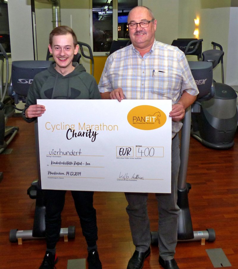 Für den guten Zweck kamen aus den Startgeldeinnahmen 400 € Reinerlös zusammen. Diese Spende überreichte Studioleiter Matthias Kolb (Foto links) im Namen des Clubs PanFIT an Josef Hofbauer, 1. Vorstand der KinderkrebsHilfe Rottal-Inn e. V., der dem Studio und den eifrigen Spinning-Teilnehmern herzlich für die Unterstützung dankte.