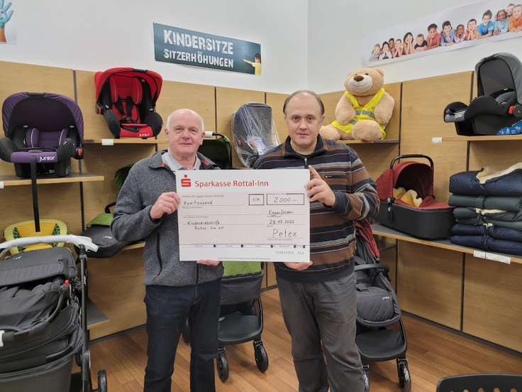Max Rutzinger, Beisitzer der KinderkrebsHilfe Rottal-Inn e.V. – Vorstandschaft, durfte erneut ins „PETEX Outlet“ im Gewerbegebiet Mitterhof, Eggenfelden kommen um die jährliche Spende von 2000 € in Empfang zu nehmen. Geschäftsführer Christian Zogler (Foto rechts) sparte wieder die Weihnachtsgeschenke für Geschäftspartner und Kunden ein und unterstützte wie in den letzten Jahren lieber den gemeinnützigen Verein der KinderkrebsHilfe Rottal-Inn.