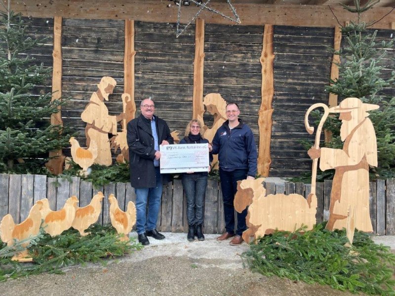 Die Übergabe des Schecks fand vor der Bretterkrippe statt, die die Einfahrt auf den Heumeier-Hof seit Adventsbeginn schmückt und immer wieder ein beliebtes Fotomotiv ist. „Sie wird mindestens noch bis nach dem Dreikönigstag hier stehen“, verriet Rosemarie Heumeier, „denn dann findet unser Rauhnachtsspektakel statt, bei dem am 6. Januar die Heiligen Drei Könige einziehen und die Krippe noch um drei Figuren erweitert wird.“