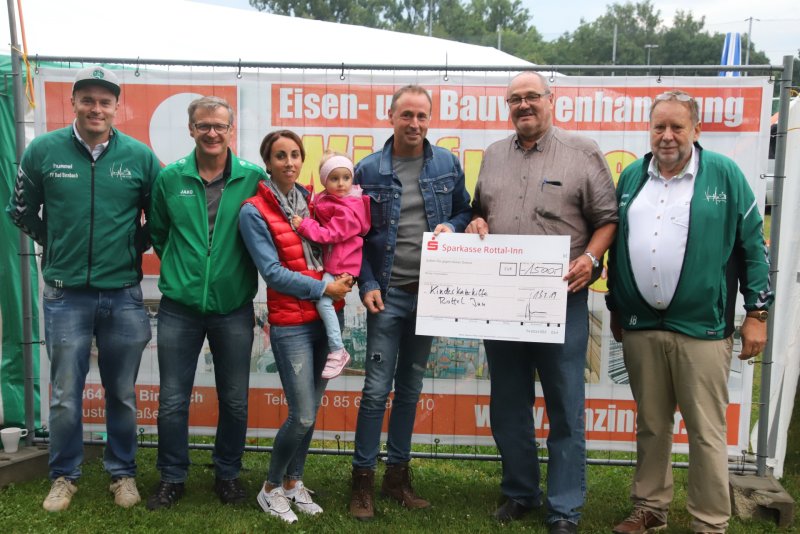Das Foto zeigt die Spendenübergabe: Im Beisein von TV-Vorstand Josef Bruckmeier überreichte Markus Dorner den Scheck an den Vorsitzenden der KinderkrebsHilfe, Josef Hofbauer: (von links) Klaus Wieland und Kassier Tom Schießl (beide vom TV), Yvonne, Emelie und Markus Dorner, Josef Hofbauer und TV-Chef Josef Bruckmeier.