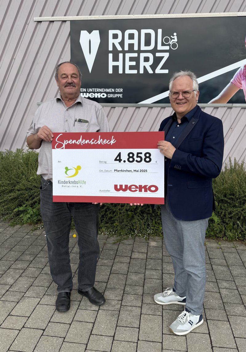 Das Foto zeigt die Spendenübergabe: vonlinks Josef Hofbauer von der KinderkrebsHilfe und Bernhard Weber, Geschäftsführer WEKO.