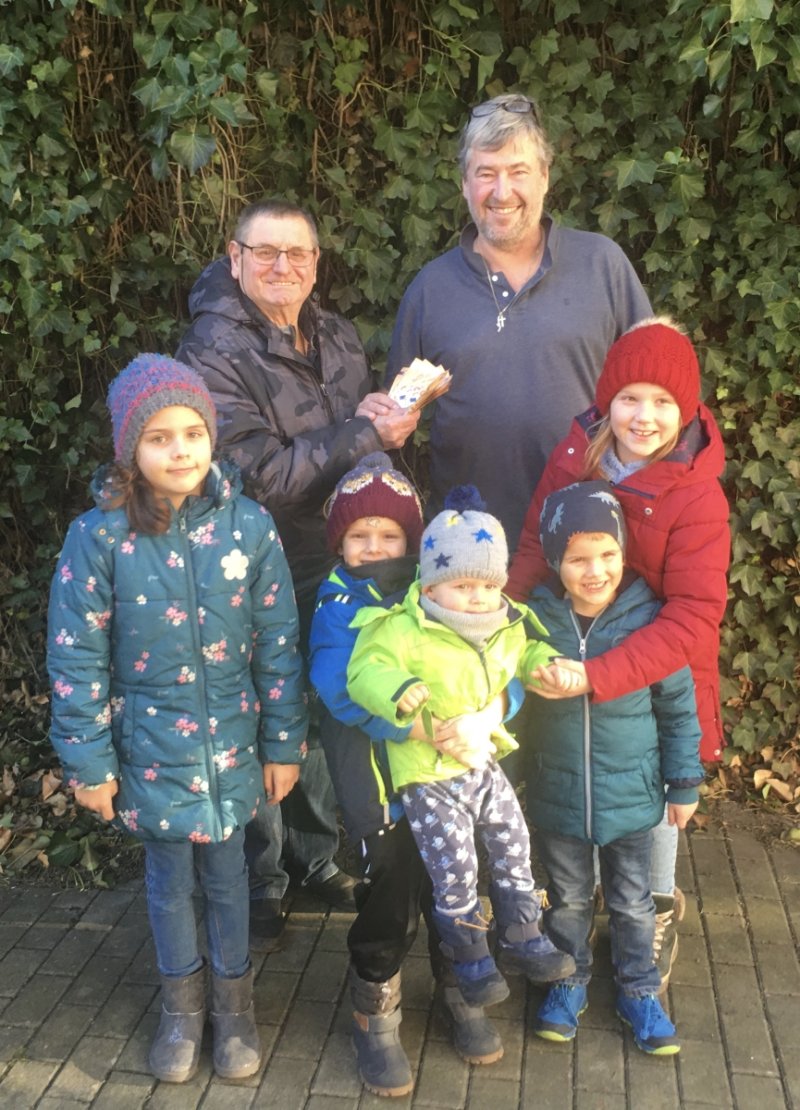 Georg Wölfl (Foto hinten links) von der Pizzeria Kreder in Jägerndorf hat im letzten Jahr das gesamte Trinkgeld, das er bekommen hat, zusammengelegt. Im Kreise einiger seiner Enkel hat er nun einen Betrag von 400 € an Rainer Schmidt, den 2. Vorstand der KinderkrebsHilfe Rottal-Inn, übergeben.