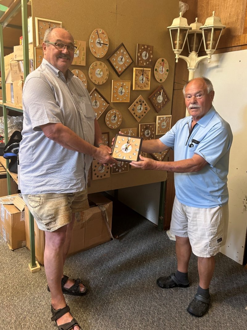 Gerhard Gscheidlinger (Foto rechts) aus Tettenweis ist ein passionierter Bastler und Tüftler. Nun hat er der KinderkrebsHilfe Rottal-Inn 30 selbst gebastelte Uhren gespendet. Josef Hofbauer durfte die Exemplare in Empfang nehmen.