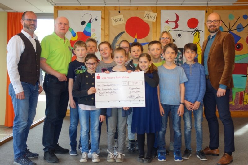 Max Rutzinger, Beisitzer der Kinderkrebshilfe Rottal-Inn, traf sich nun mit dem Spenderteam um Rektor Matthias Schmöller, Elternbeirats-Vorsitzenden und Organisator Christian Jaeger, Lehrerin Rita Gruber-Scheck und einigen Kindern zur Spendenübergabe. Er erläuterte die Arbeit des Vereins und bedankte sich für die Unterstützung und sicherte den interessierten Viertklässlern zu, das Geld u.a. in die Erfüllung von Wünschen der erkrankten Kinder einfließen zu lassen.