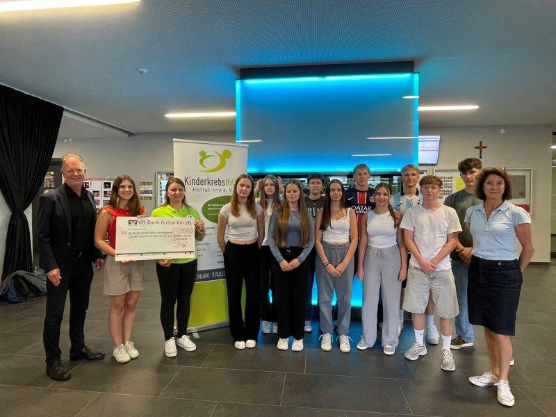 Das Foto zeigt die Spendenübergabe mit Schulleiter Edgar Nama (von links), Magdalena Maschberger (Projektleiterin Schüler), Andrea Gutzmann (KinderkrebsHilfe), Lara Latzlsperger, Hanna Huber, Tringa Loshi, Hanna Kalle, Sina Blümlhuber, Jonas Rieder, Lea Voigt, Tobias Fürstberger, Ben Bauer, Marvin Wurhofer und Kathrin Kropf (Kursleiterin).
