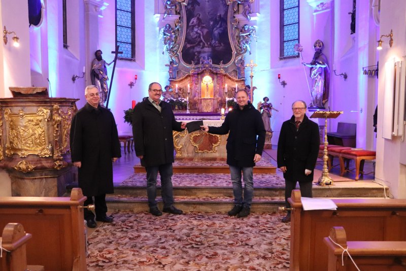 Seit 19 Jahren unterstützt deswegen der Heimatsingkreis zusammen mit verschiedenen Chören, Instrumentalisten, Organisten, prominenten Künstlern und den örtlichen Vereinen die KinderkrebsHilfe Rottal-Inn mit einem adventlichen Benefizkonzert. Aufgrund der Pandemie und den dazugehörigen Auflagen war es in diesem Jahr allerdings nicht umsetzbar. Doch helfen kann man immer, dachte sich Christian Sommer und rief zu einem Spendenmarathon auf, der von Anfang November bis zum Nikolaustag sämtlich dagewesene Rekorde schlug. Allein beim Kirchenbesuch am Nikolaustag füllte sich das Spendenkörbchen mit 3827,41 €. Mit dem Verkaufsstand der Ministranten, die ganztags Plätzchen und Selbstgebasteltes unter der Leitung von Lisa Gurtner verkauften (550 €), und dem kostenlosen Spendenkonto waren es am Ende 8242,41 €, die Christian Sommer an Josef Hofbauer von der KinderkrebsHilfe übergeben konnte.