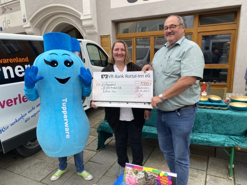 Helga Burner ist Tupperware-Vertreterin und in dieser Funktion überreichte sie, unterstützt durch das Tupperware-Maskottchen, 800 € Geldspende und Sachspenden im Wert von mind. 200 € an den 1. Vorstand der KinderkrebsHilfe Rottal-Inn e.V. Josef Hofbauer.