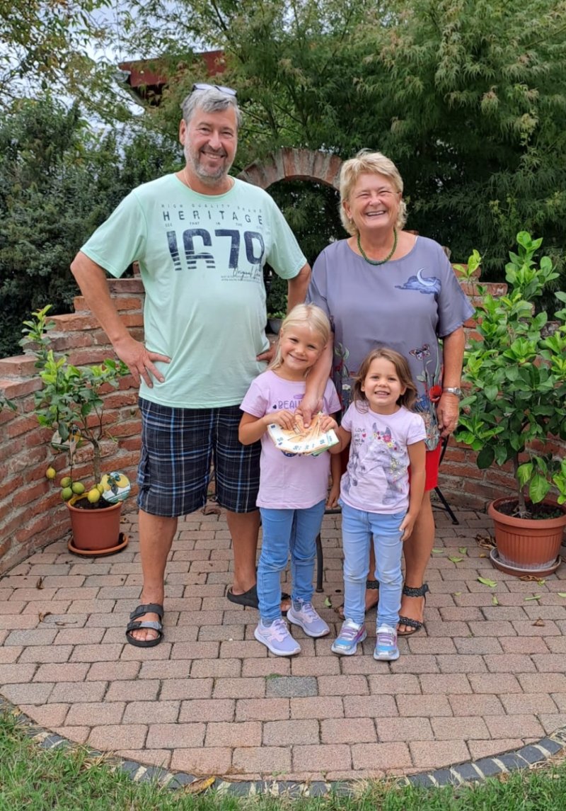 Das Foto zeigt die die Übergabe der Spende von Hildegard Aigner an Rainer Schmidt, den 2. Vorstand der KinderkrebsHilfe Rottal-Inn, im Beisein ihrer Enkelinnen Magdalena und Johanna.
