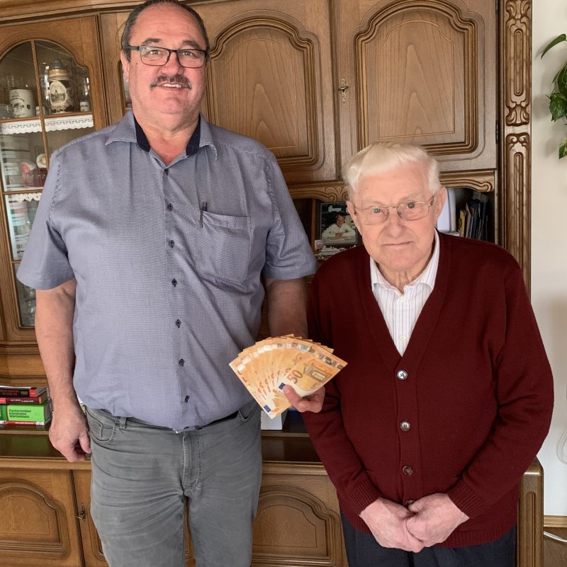 Gefeiert wurde der runde Geburtstag natürlich gebührend und Johann Schlags Freunde, die Nachbarn und seine Familie kamen seinem Wunsch nach und so konnte Josef Hofbauer, 1. Vorstand des begünstigten Vereins, den schönen Betrag von 900 € in Empfang nehmen. Während sich Hofbauer für die erneute Spende bedankte, meinte Schlag, dass das nur dank seiner Gratulanten möglich war.