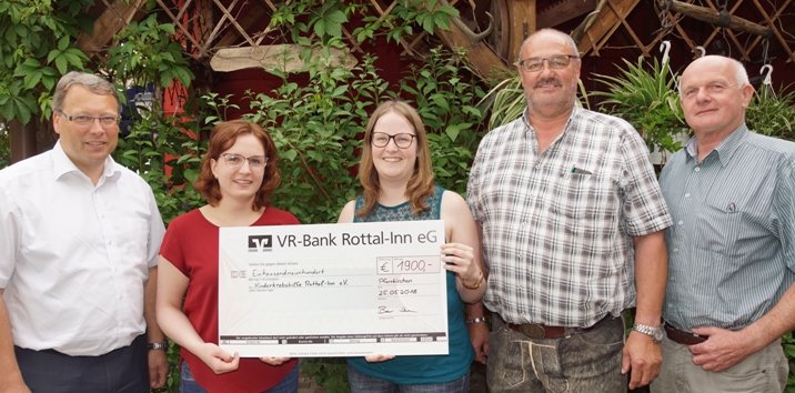 Das Foto zeigt die Spendenübergabe: Lea Schwarz und Renate Bauer (2. und 3. von links) übergaben den Spendenscheck über 1900 € an den Vorsitzenden der Kinderkrebshilfe Rottal-Inn, Josef Hofbauer (2. von rechts). Trachtenvereinsvorstand Thomas Eiglsperger (links) und Max Rutzinger, Beirat bei der Kinderkrebshilfe (rechts) waren von der Höhe des eingespielten Betrags angetan.