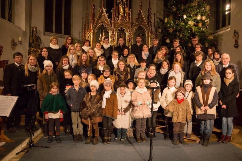 Das Foto zeigt alle Beteiligten des Adventssingen von 2016: Chorleiter Anton Grötzinger (links), die Instrumentalistinnen Johanna Kronberger und Nicole Wilhelm, die Mitglieder des Staudacher Jugendchores, des Staudacher Kinderchores und der Sprecher und Texter Josef Hirl (rechts).