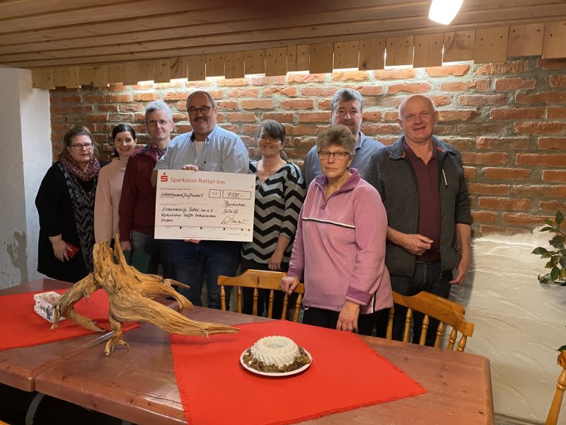Ein Teil der Vorstandschaft mit dem symbolischen Scheck: von links Karin Peklo (Beisitzerin), Claudia Wimmer (1. Schriftführerin), Fritz Dietl (Kassier), Josef Hofbauer (1. Vorstand), Petra Pawlitschko (Familienbetreuerin), Rainer Schmidt (2. Vorstand), Traudl Makat (Beisitzerin) und Max Rutzinger (Beisitzer).