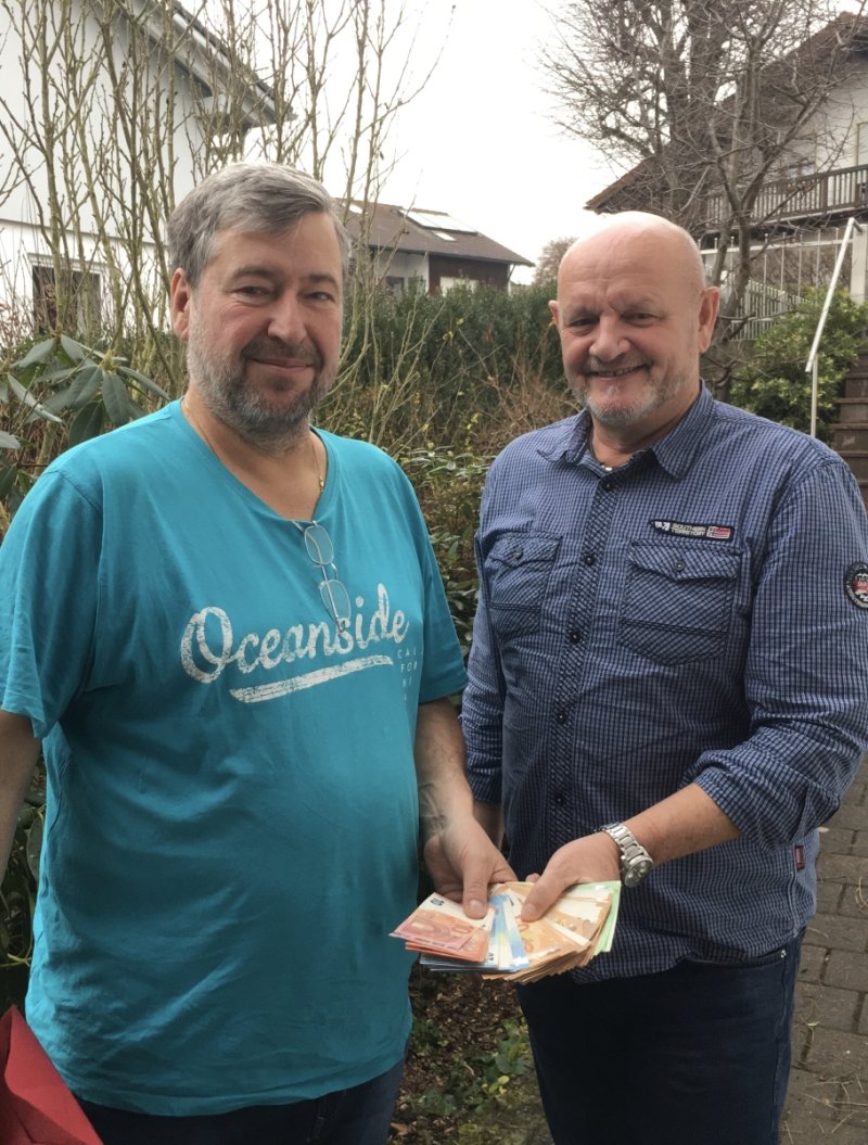 Klaus Altmann aus Landau an der Isar (Foto rechts), Freund und Ex-Kollege von Rainer Schmidt dem 2. Vorstand der KinderkrebsHilfe Rottal-Inn, übergab Rainer Schmidt den sagenhaften Betrag von 2000 €.