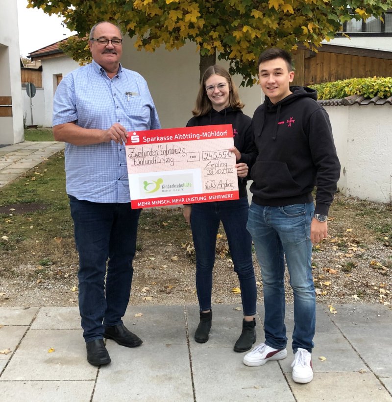 Einen Teil der Einnahmen in Höhe 245,55 € durfte nun Josef Hofbauer, 1. Vorsitzender der KinderkrebsHilfe Rottal-Inn, aus den Händen von Kassierin Laura Kneißl und Vorsitzenden Dennis Hübel entgegennehmen.