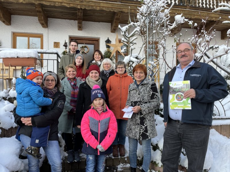 Das Foto zeigt die Spendenübergabe: von links Christine Huber mit Dominik und Nina, Sandra Alfranseder, Julian Ebenhofer, Sophia Wachter, Bernadette Eder, Elfriede Bründl, Elisabeth Houf, Karin Zinsberger, Siglinde Eder und Josef Hofbauer.