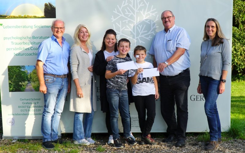 Das Foto zeigt die Spendenübergabe: von links Gerhard Schmid, Andrea von Lösch, Ilona Spielberger mit ihren Söhnen Felix und Paul, Josef Hofbauer und Doris Seibold