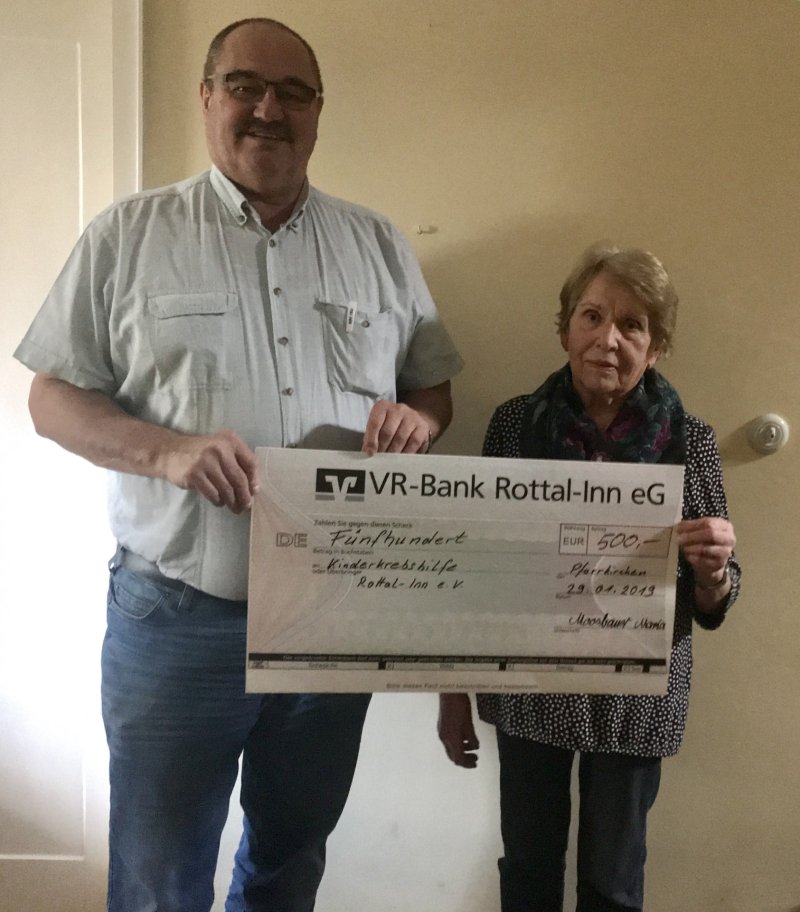 Maria Moosbauer aus Pfarrkirchen feierte ihren 80. Geburtstag. Feiern gehört zu so einem Jubelfest dazu, aber Geschenke wollte die 80-jährige nicht bekommen. Sie verzichtete zu Gunsten der Kinderkrebshilfe Rottal-Inn e.V. und konnte nun an Josef Hofbauer 500 € überreichen.
