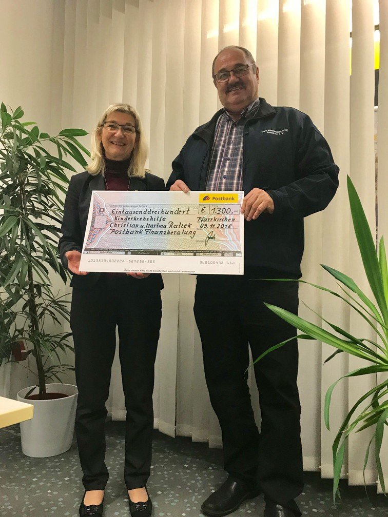 Dauerspender Martina und Christian Ratzek haben während des Jahres wieder Spenden gesammelt und heuer konnte Martina Ratzek 1300 € an Josef Hofbauer für die Kinderkrebshilfe Rottal-Inn e.V. weitergeben. In der Geschäftsstelle der Postbank Finanzberatung Pfarrkirchen, wo Martina Ratzek arbeitet, trafen sich die beiden zur Spendenübergabe. Josef Hofbauer berichtete, dass der Verein momentan 45 Familien betreut, die Anzahl ist in den letzten beiden Monaten angestiegen. Martina kennt die Vereinsgeschichte mittlerweile gut und sie und ihr Mann freuen sich, mit der Spende jungen Familien, denen es nicht so gut geht, zu helfen.