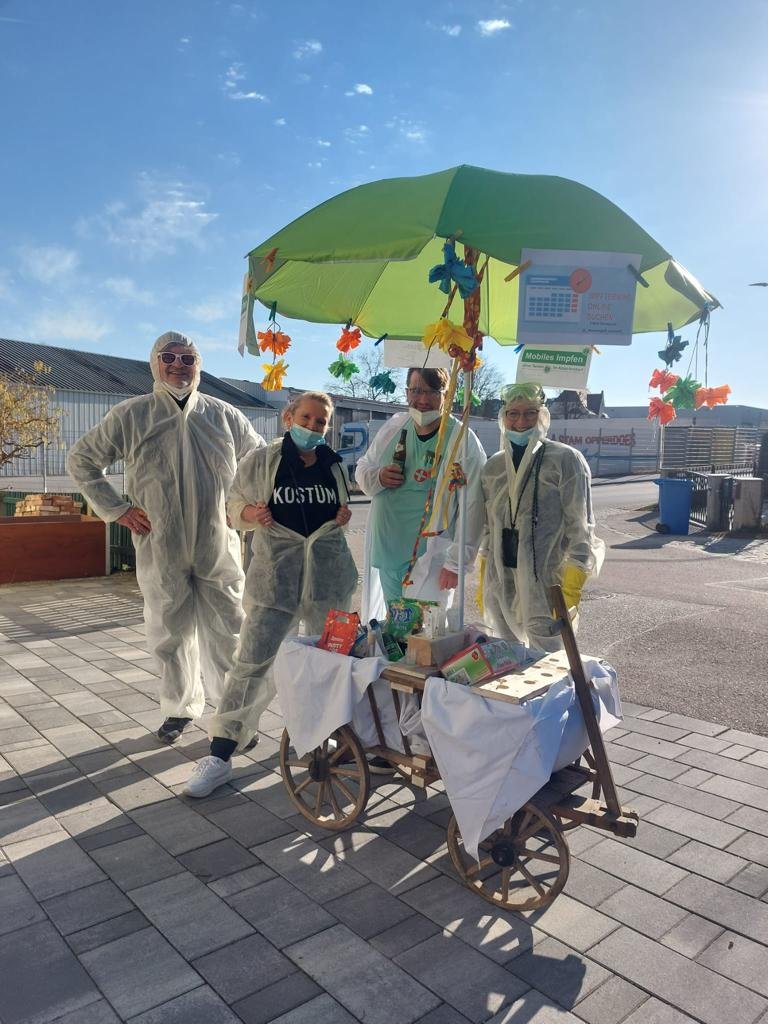 Eine nette Aktion haben sich die Betreiber/Bedienungen vom Monaco Pub einfallen lassen. Weil ja faschingmäßig nicht viel ging sind Roland Berr, Claudia Ecker, Gitti Hölzl und Sven Wilde am Faschingsdienstag als mobiles Impfteam durch Arnstorf gezogen und haben Schnaps, abgefüllt in Spritzen feilgeboten. Einige Spritzenverweigerer haben einfach so gespendet.