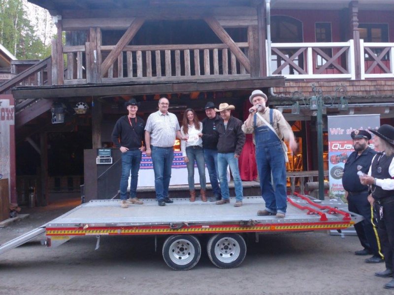 Da hat sich Josef Hofbauer gefreut: Beim Quad-Treffen in Pullman City bekam der 1. Vorstand der Kinderkrebshilfe Rottal-Inn (Foto Zweiter von links) von Westernstadt-Geschäftsführer Claus Six (Zweiter von rechts) einen symbolischen Scheck in Höhe von 2500 € überreicht. “Das ist ein Riesenbetrag und eine große Unterstützung für unsere Arbeit”, bedankte sich Hofbauer.