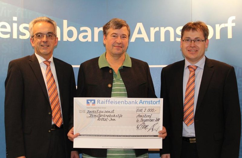 Wie auch im letzten Jahr spendete die Raiffeisenbank Arnstorf auch heuer wieder 2000 € an unseren Verein. Wie die Vorstände Wilfried Pex (Foto links) und Martin Salzberger (rechts) bei der Spendenübergabe an den 2. Vorstand der Kinderkrebshilfe Rottal-Inn Rainer Schmidt mitteilten, wurde anstatt Weihnachtsgeschenke für Großkunden zu kaufen, lieber an unseren Verein gespendet.