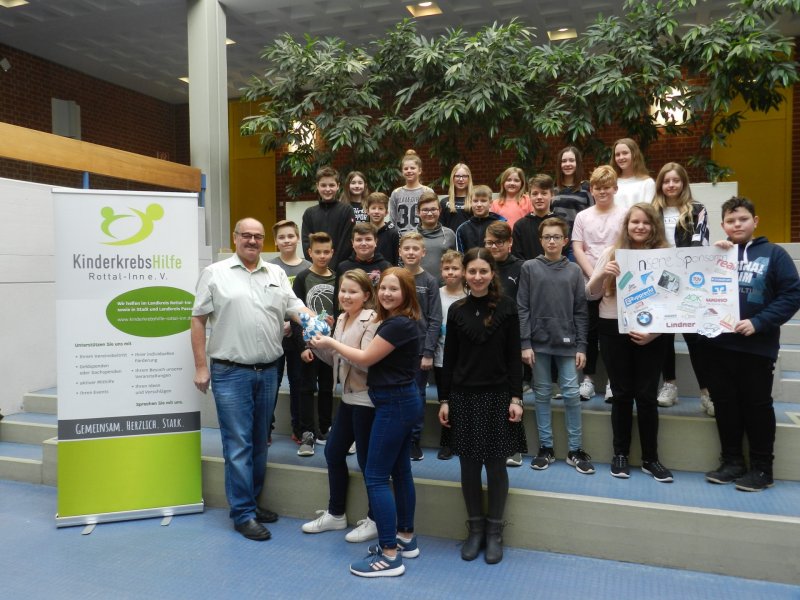 Gutes tun und gewinnen” – so lautete das Motto der Spendenaktion der Klasse 6d der Realschule beim Tag der offenen Tür. Der Erlös wurde nun der KinderkrebsHilfe Rottal-Inn überreicht. Mit ihrer Idee rannten die Schüler bei Direktor Franz Griebl offene Türen ein. Unterstützt von Sponsoren aus der Region, wurde jede Spende mit attraktiven Werbegeschenken und Gutscheinen belohnt. Neben einer Spendenbox konnten die Besucher ihr Glück beim Becherrücken, am Glücksrad oder einem eigens von den Schülern erstellten Krebs-Quiz versuchen. Die Mädchen und Buben hatten die gesamte Aktion unter der Betreuung ihrer Klassenlehrerin Martina Loibl organisiert. 360 € konnte Josef Hofbauer, Vorsitzender der KinderkrebsHilfe, entgegennehmen.
