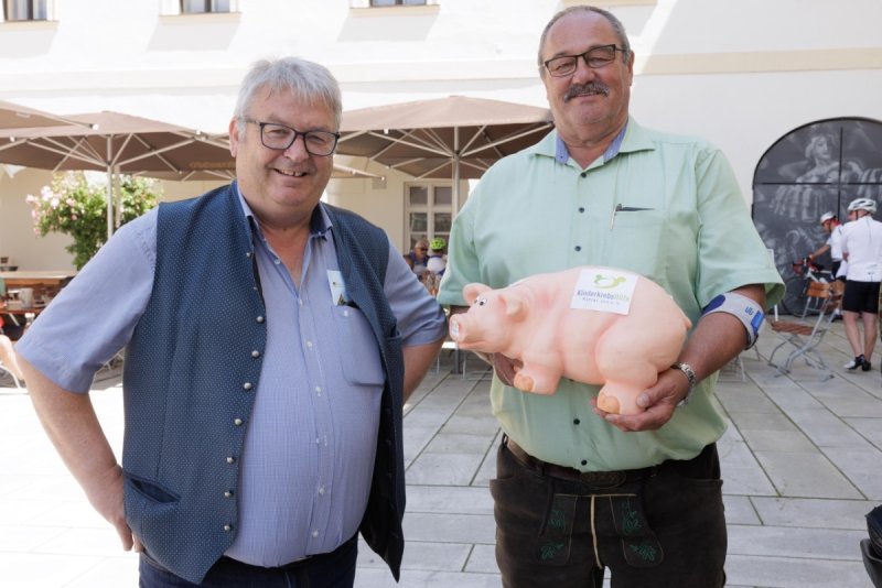 Das Foto oben zeigt die Spendenübergabe: Harald Mayrhofer (links) und Vorstand der KinderkrebsHilfe, Josef Hofbauer, mit der Spendensau.