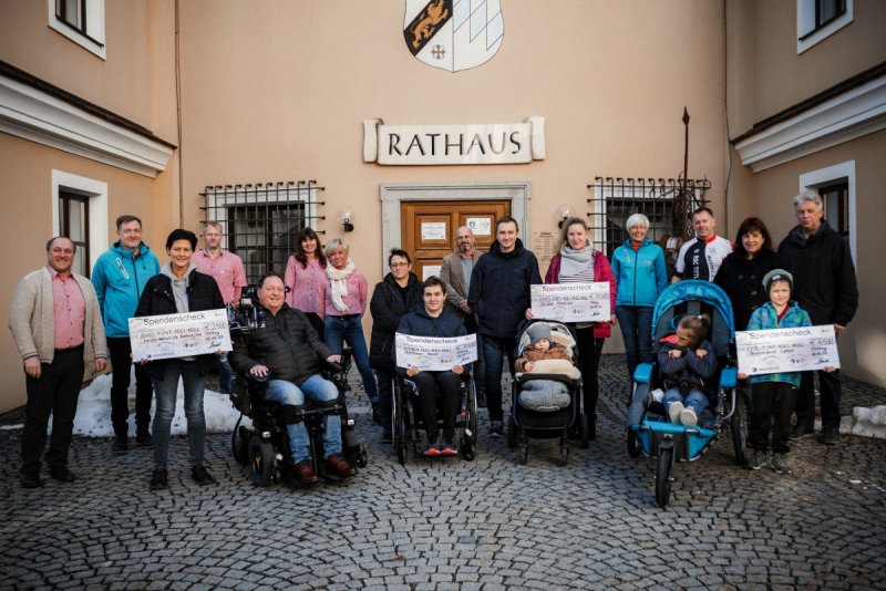 Das Foto zeigt die Übergabe der gigantischen Spendensumme des RSC Tittling mit seinem Vorstand Günther Schwarzkopf (5.v.l.) im Beisein von Tittlings Bürgermeister Helmut Willmerdinger (l.) und dem RSC-Team an die verschiedenen Empfänger, darunter Edith Lindbüchler (3.v.l.)