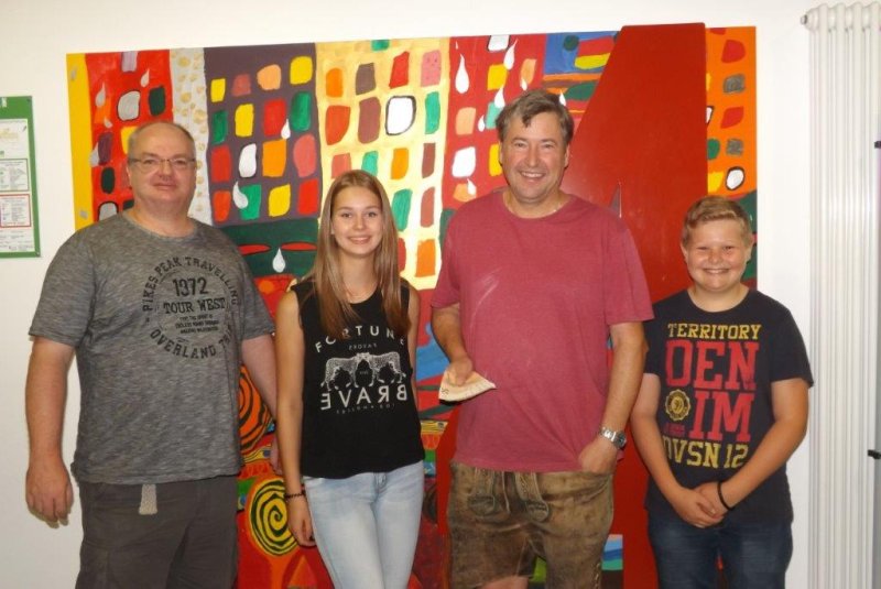 Das Foto zeigt die Spendenübergabe: Die Schülerfirmenmitarbeiter Laura Wimmer und Matthias Wimmer übergaben mit dem projektleitendem Lehrer, Herrn Maier, die 350 € an den 2. Vorstand der Kinderkrebshilfe Rottal-Inn, Rainer Schmidt (Foto Zweiter von rechts).