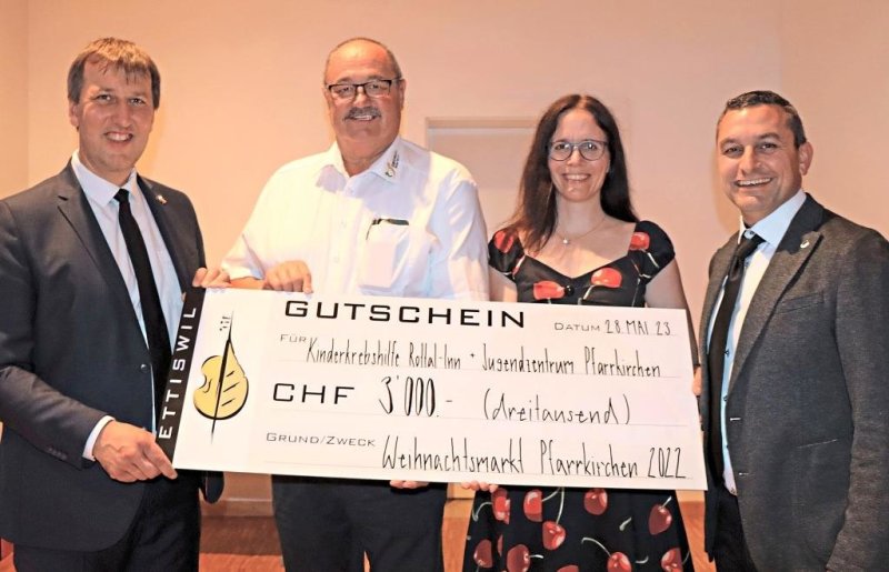 Am Rande der Jubiläumsfeier zum 25-jährigen Bestehen der Städtepartnerschaft zwischen der Rottaler Kreisstadt und dem italienischen San Vincenzo hat Gemeindepräsident Samuel Kreyenbühl aus dem ebenso freundschaftlich verbundenen Schweizer Rottal dem Jugendzentrum Pfarrkirchen und der KinderkrebsHilfe Rottal-Inn zusammen 3000 Schweizer Franken (entspricht etwa 3000 €) gespendet.