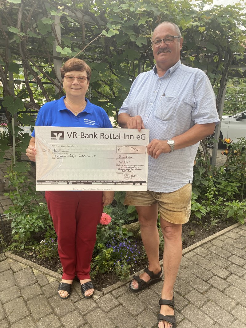 Bereits im Vorfeld hatten die Mitglieder beschlossen, dass sie die Hälfte des Erlöses an die KinderkrebsHilfe Rottal-Inn spenden wollen. Am Veranstaltungstag kamen bei hervorragendem Wetter zahlreiche Besucher in die Rennbahn, so dass am Verkaufsstand alles verkauft wurde. Ilse Gärtner traf sich nun mit dem 1. Vorstand der KinderkrebsHilfe Rottal-Inn Josef Hofbauer und konnte ihm einen Scheck von 500 € aus dem Verkauf überreichen.
