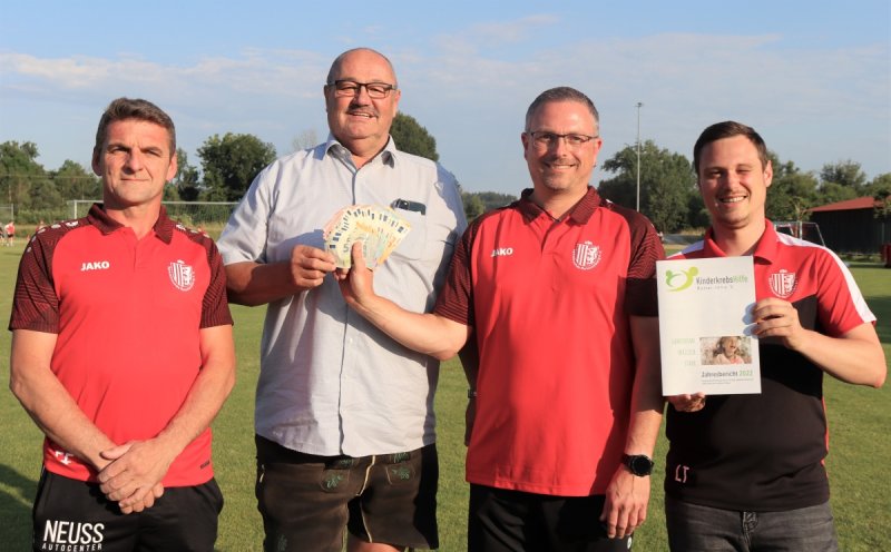Das Foto zeigt die Spendenübergabe auf dem Vereinsgelände: von links Co-Trainer Edin Fazlic, KinderkrebsHilfe-Chef Josef Hofbauer, Fußball-Abteilungsleiter Reinhard Maier und Stellvertreter Tom Lobmeier. Der Vorsitzende der Hilfsorganisation erklärte, dass das Geld derzeit 43 bedürftigen Familien in Rottal-Inn und Passau zu Gute komme.